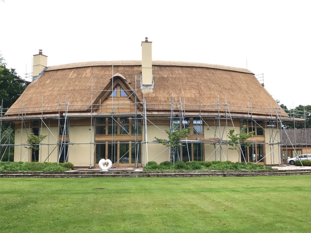 Croft House is a brand new house thatched in water reed with turnover block pattern ridge