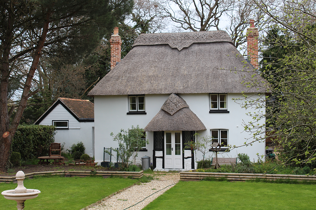 A cottage which has been re-ridged with a block pattern turnover ridge with all thatch thoroughly cleaned and re-dressed