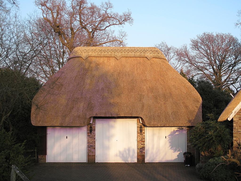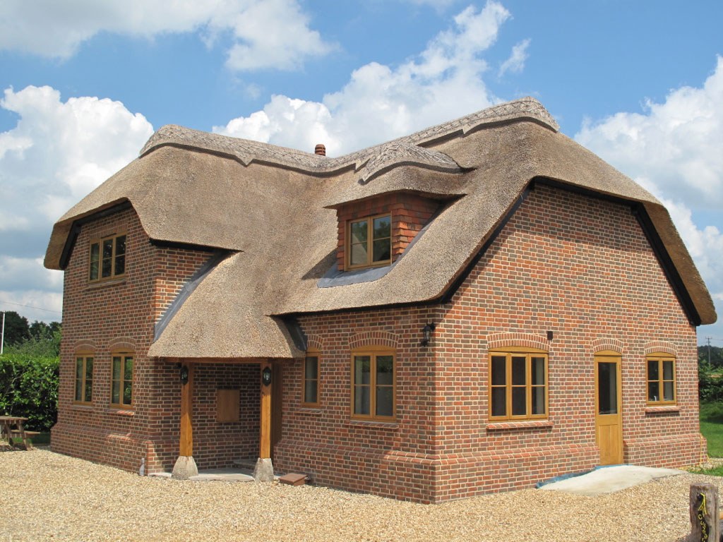 A new cottage which has been thatched in water reed with a block pattern ridge