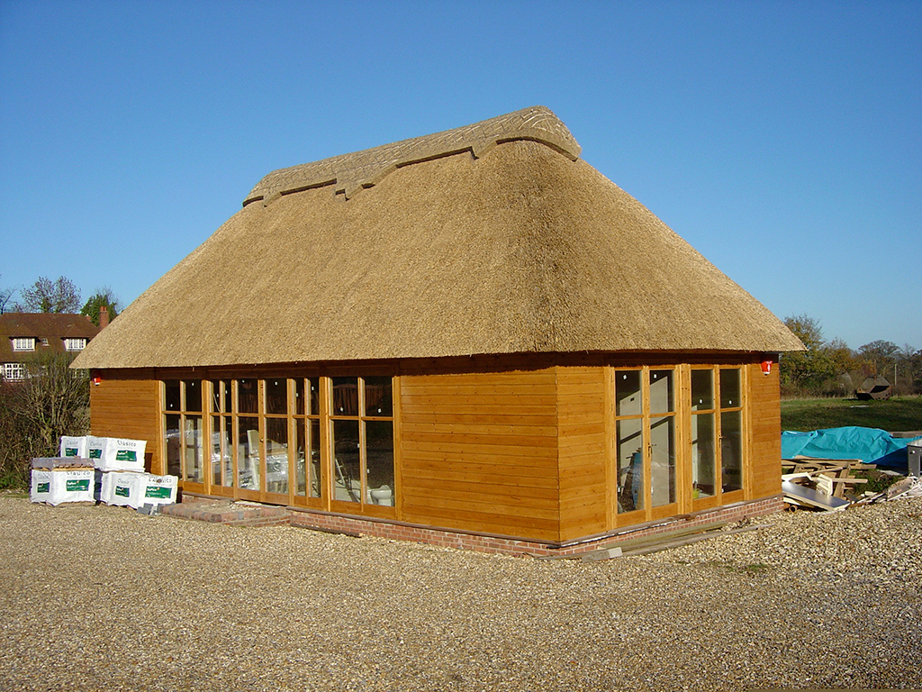 Newly thatched office in water reed with a wheat reed straight and diamond ridge